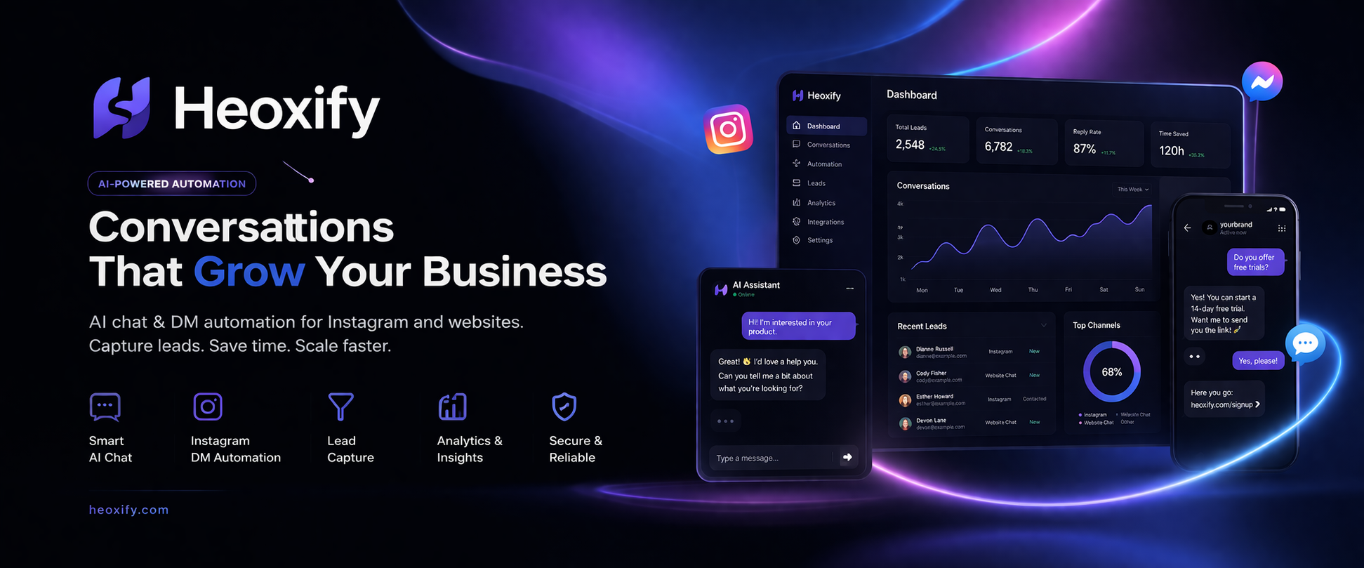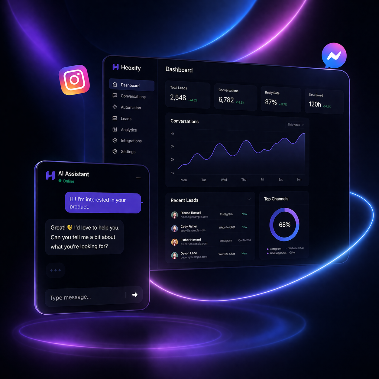Heoxify unifies Instagram DMs and website chat—so your AI answers in your brand voice and every serious lead is captured before it goes cold.
